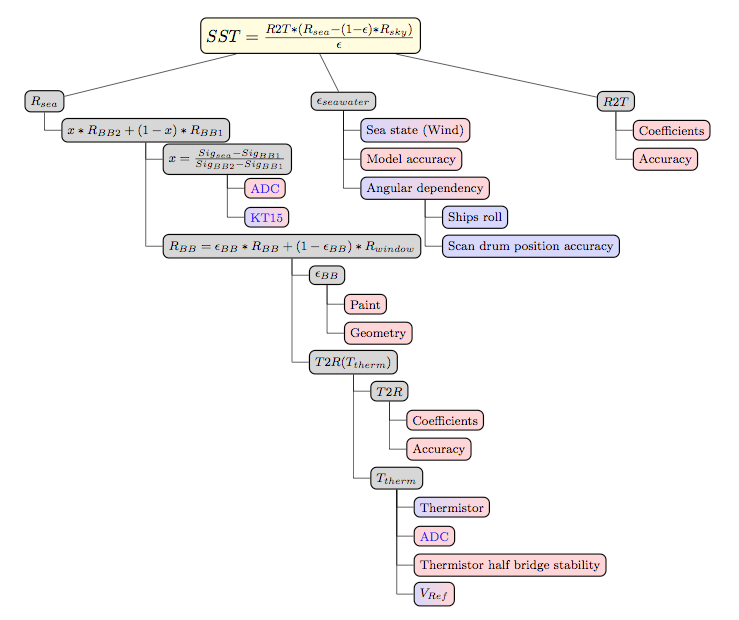 Figure 2: The ISAR SST Measurements equation featuring a breakdown of some of the main elements of the ISAR SST processor to show the factors that introduce uncertainties. The boxes coloured in blue represent type A uncertainties, boxes coloured in red show type B uncertainties, and boxes in red and blue contain both type A and type B uncertainties. R2T stands for radiation to temperature transformation, Rsea is the radiation from the sea, Rsky the radiation from the sky, ε the seawater emissivity, RBB1,2 the radiation from the two on-board black bodies, SigSea, SigSky, SigBB1,2 are the signal from the detector when viewing the sea, sky of the two black bodies (Wimmer and Robinson, 2016).