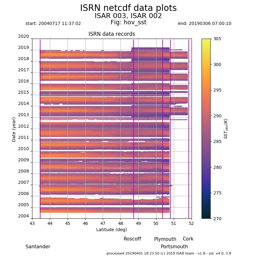 The ISAR validation tool uses the Felyx match-up database (MDB) files and follows the procedure as described in Wimmer et al. 2012 by using the Felyx MDB files and working from the central radiometer and SLSTR pixel match outwards until the edge of the match-up window is reached. This is done for 5 match-up windows (1: 0.5h 1km; 2a: 0.5h 20km; 2b: 2h 1km; 3: 2h 20km; 4 6h 25km ) and for Gaussian and robust statistics producing location plots of the central match, histograms, dependence plots for wind speed, latitude and uncertainty. The plots and statistics are produced for each level 2 SLSTR variable, including D3, D2, N3, N2, auxiliary SST products and water surface temperature (WST i.e. the best available SST).