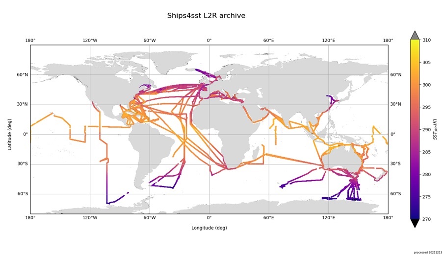 The L2R data currently in the ships4sst archive (December 2021), shown as SST on a world map:
